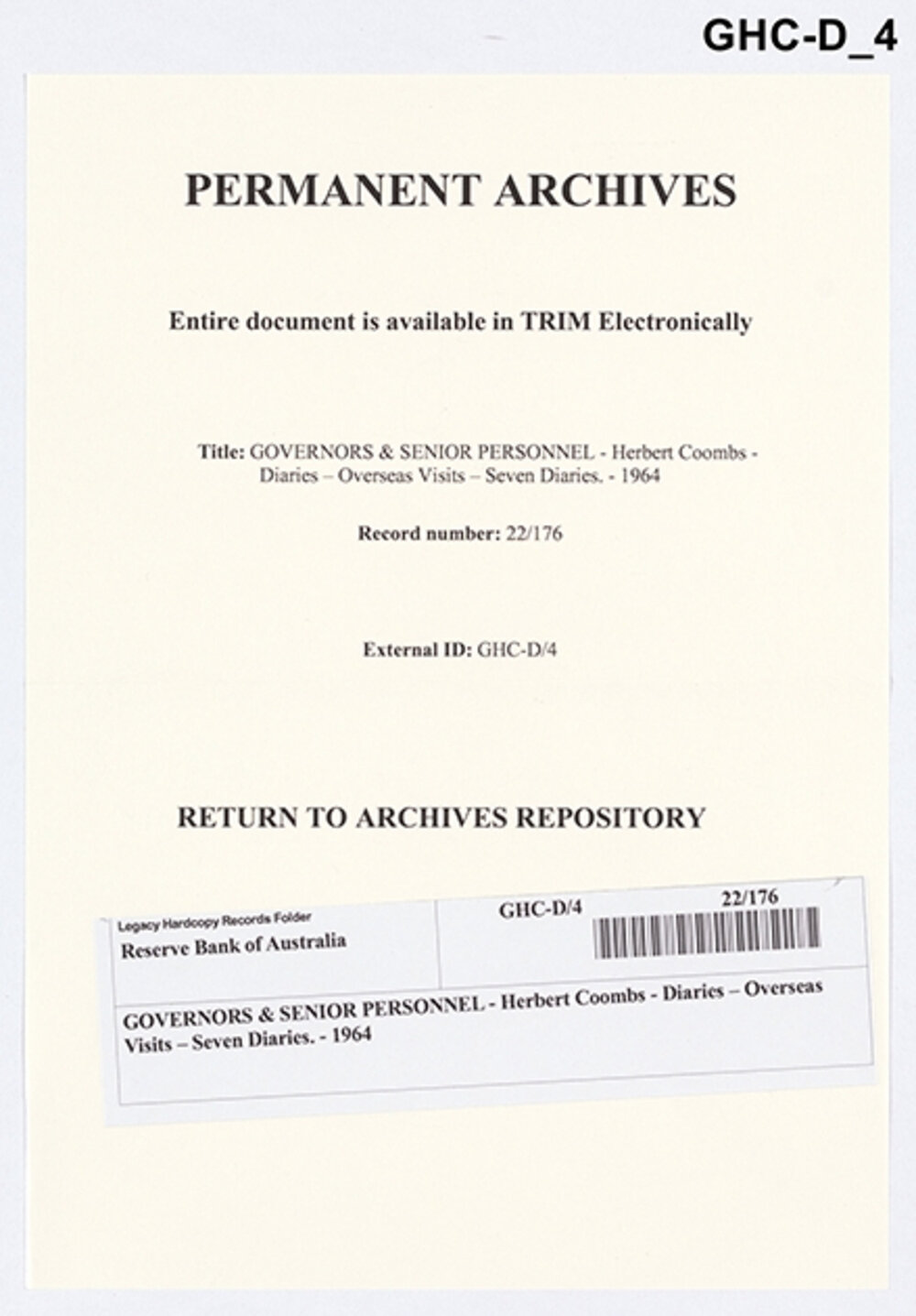 Except as otherwise indicated within this work, this work is licensed under a Creative Commons Attribution 4.0 International LicenceGOVERNORS & SENIOR PERSONNEL - Dr H.C. Coombs - Diaries - Overseas Visits - Seven Diaries - 1964
